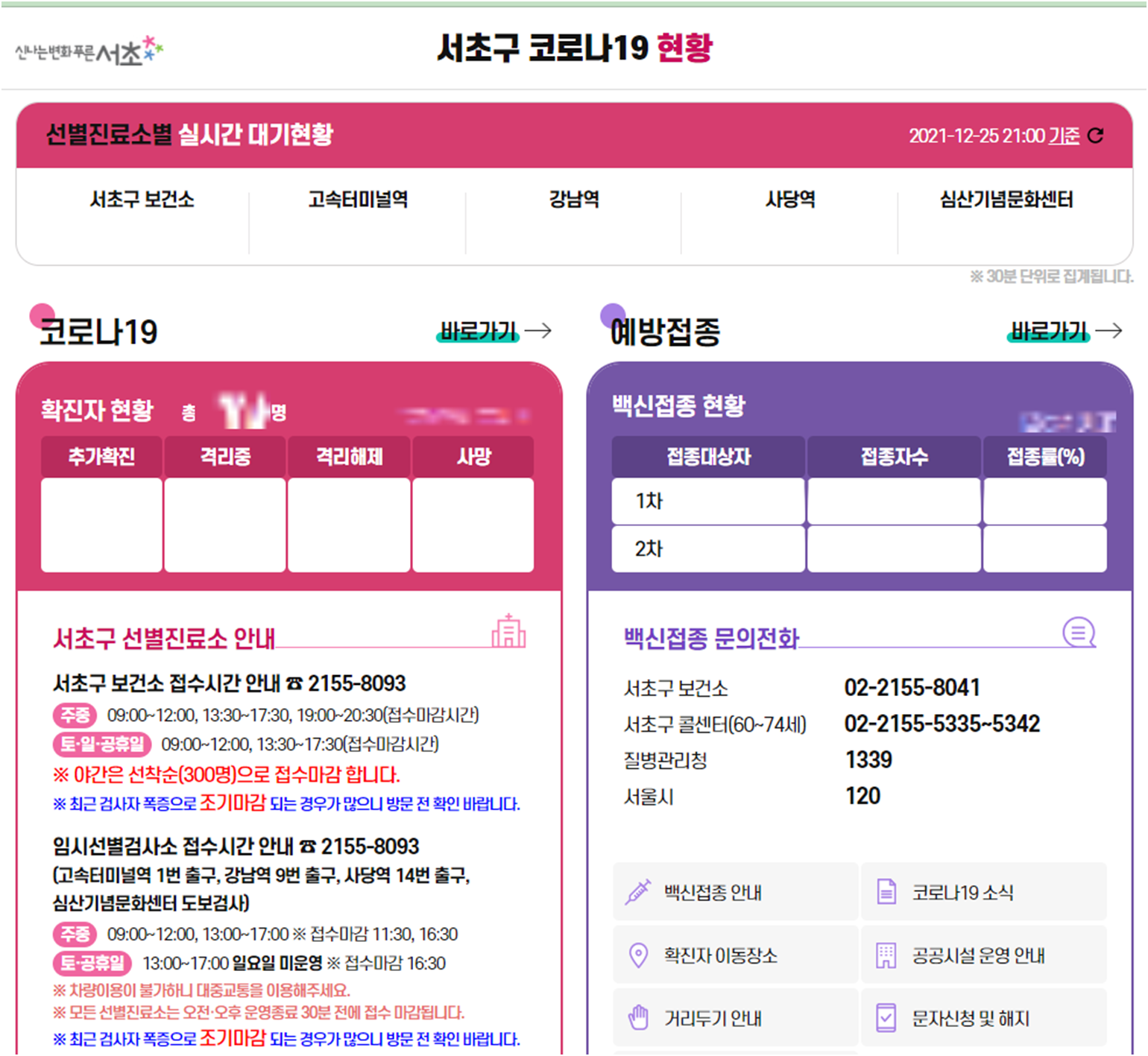 서초구의 코로나19 관련 각종 정보를 확인할 수 있습니다. 주로 서초구내 확진자수, 주요 이동동선, 백신접종 현황, 선별진료소 위치 및 대기현황 등에 대해 확인할 수 있으며, 서초구 재난안전대책본부에서 발행하는 각종 뉴스/소식 정보도 확인할 수 있습니다.