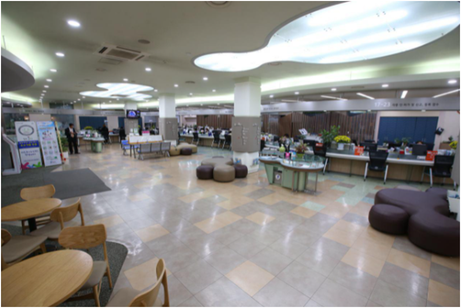 구청 민원실에 대한 정보를 확인할 수 있습니다. 또한 "민원대기현황" 메뉴를 이용하며 민원 창구별 대기 현황을 실시간으로 확인할 수 있습니다.