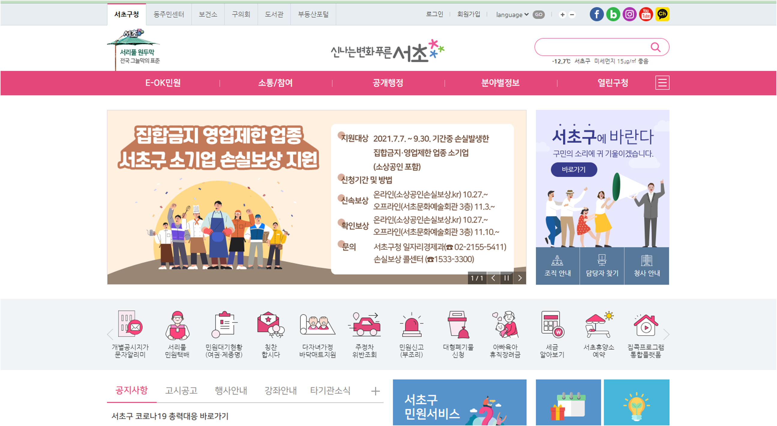 안녕하세요, 오늘은 "신나는변화 푸른 서초" 서울시 서초구청 홈페이지 바로가기 방법에 대해 함께 알아보는 시간을 가져보겠습니다. 서초구청 홈페이지를 통해 서초구 코로나 현황을 확인할 수 있을 뿐 아니라, 각종 민원/복지/행정/구인구직 등에 대한 정보를 확인할 수 있습니다.