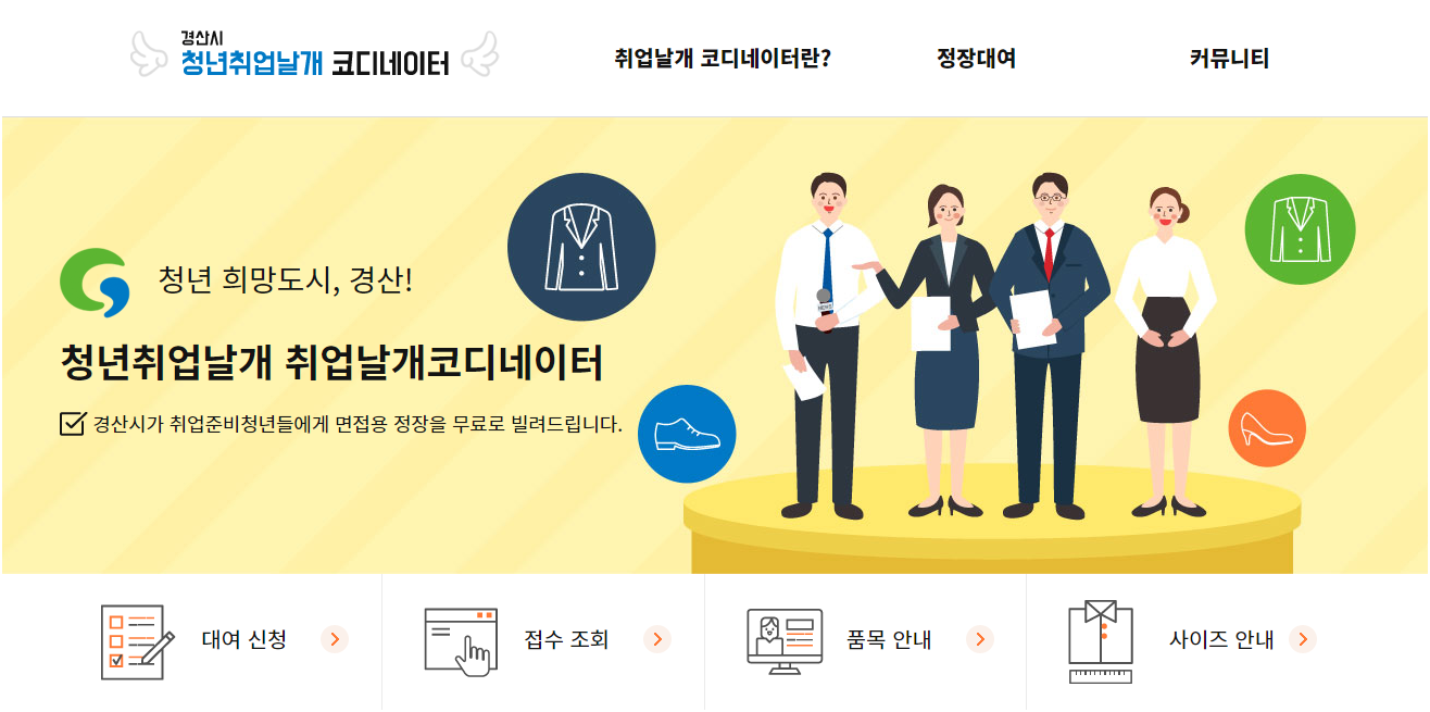 경산시는 청년분들의 취업을 돕기 위해 청년취업날개 코디네이터라는 프로그램을 통해 취업준비청년들에게 면접용 정장을 무료로 빌려주고 있습니다. 경산시에 거주하는 만39세 이하의 청년이면 누구나 신청 가능하며 1회에 최대 3박 4일간 대여가 가능하며, 연간 최대 3회까지 대여가 가능합니다.