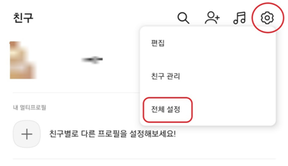 카카오톡에 접속하여 우측 상단에 있는 톱니바퀴 모양의 설정 버튼을 누르고, 전체 설정 메뉴를 눌러줍니다.