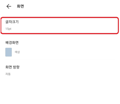 다음 그림과 같이 화면메뉴창이 나타나면, 첫번째에 위치한 글자크기를 선택해 줍니다.