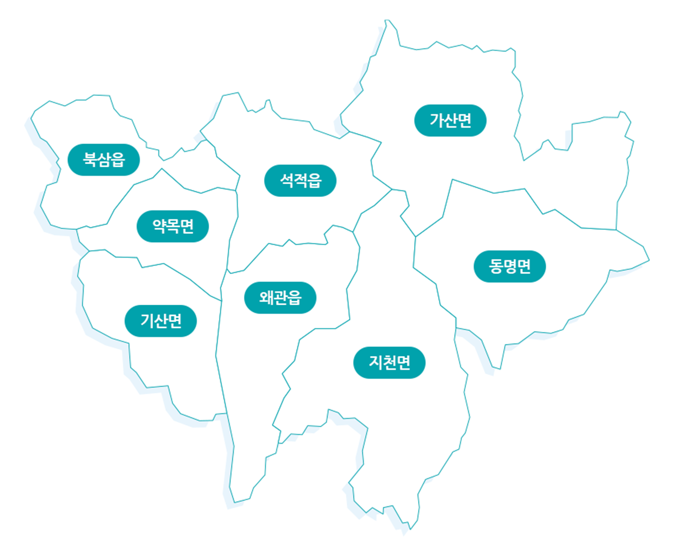 칠곡군의 행정구역은 3읍5면으로 구성되어 있습니다. 칠곡소개>읍면안내 메뉴를 이용하면 각 읍면의 지역정보를 확인할 수 있습니다. 확인 가능한 지역정보는 각 읍면 페이지마다 조금씩 다르지만, 일반적으로 인구/면적 등의 정보 및 역대 읍면장, 그리고 읍면사무소 찾아오시는 길 등을 확인 가능합니다.
