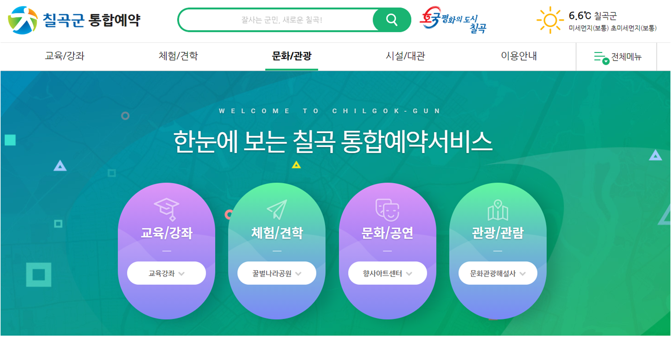 홈페이지 메인화면 상단의 "통합예약" 메뉴를 이용하면 칠곡군에서 운영하는 다양한 교육/강좌, 체험/견학, 문화/공연, 관람/관광 프로그램 및 시설을 예약할 수 있습니다. 향사아트센터, 교육문화회관 공연장 등의 대관 예약을 이 곳에서 진행할 수 있습니다.