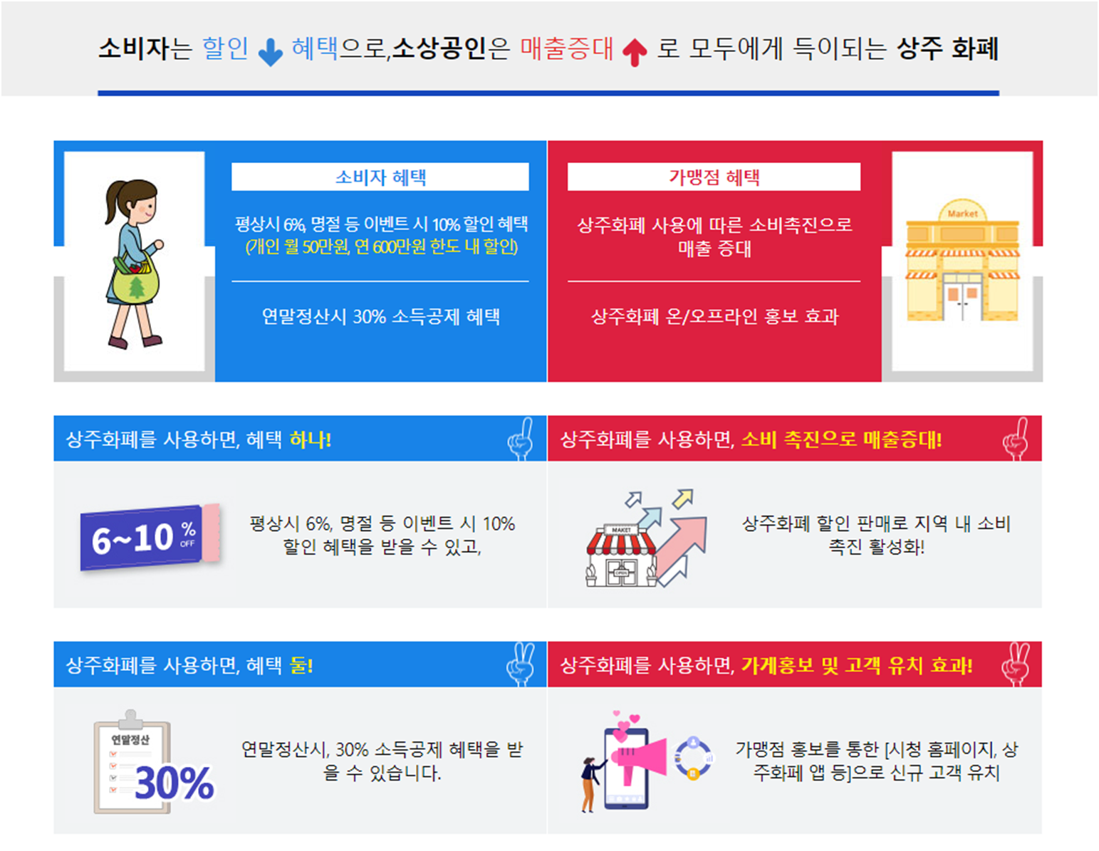 상주시는 지역자금의 역외유출을 막고 지역경제를 활성화하기 위해 상주화폐라는 이름의 지역화폐를 운영하고 있습니다. 상주화폐 가맹점에서 상주화폐를 이용하여 물건을 구입하면 구입하는 모든 물품에 대해 평상시 6%, 그리고 명질 또는 특별 이벤트 시 10%의 할인 혜택을 받을 수 있습니다. 뿐만 아니라 연말정산 시 30%의 소득공제 혜택을 받을 수 있습니다.