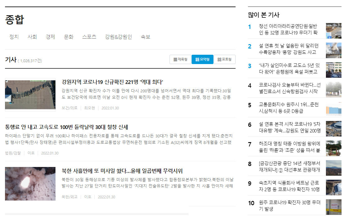 강원도내 각 지역의 기사를 골라 읽을 수 있는 메뉴입니다. 지역별 시정/군정 현황, 코로나19 현황 등을 확인할 수 있습니다.