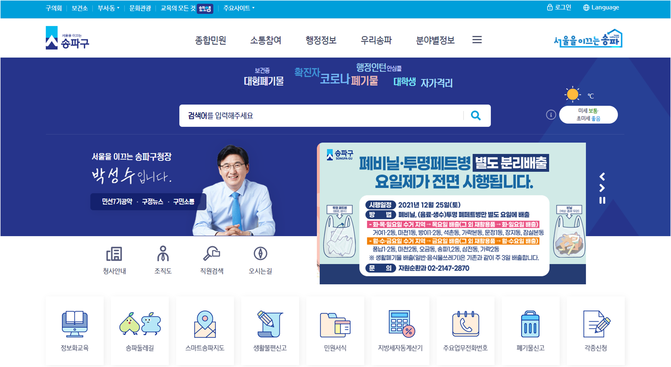 구청 사이트에 접속하면 위와 같은 메인화면 모습을 확인할 수 있습니다. 송파구청 홈페이지에는 구민을 위한 다양한 서비스를 제공하고 있는데, 대부분의 기능은 메인화면 상단에 있는 메뉴창을 이용하여 확인할 수 있습니다.