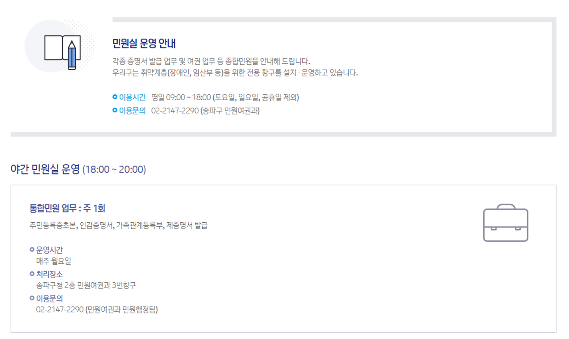 송파구 민원실은 평일 09시부터 18시까지 운영하며, 이용문의는 송파구 민원여권과 (02-2147-2290)으로 연락하면 됩니다. 야간 매주 월요일은 18:00~20:00시까지 야간 민원실을 운영을 통해 주민등록증초본, 인감증명서, 가족관계등록부, 제증명서 발급 등의 업무를 처리하고 있으니 참고하시길 바랍니다.