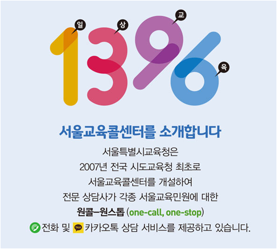 참고로, 서울시교육청은 교육콜센터를 운영하여 전문 상담사가 각종 민원상담을 진행하고 있습니다. 콜센터는 (02)1396으로 전화하여 상담받을 수 있으며, 상담시간은 평일 오전 8시부터 오후 6시까지입니다.